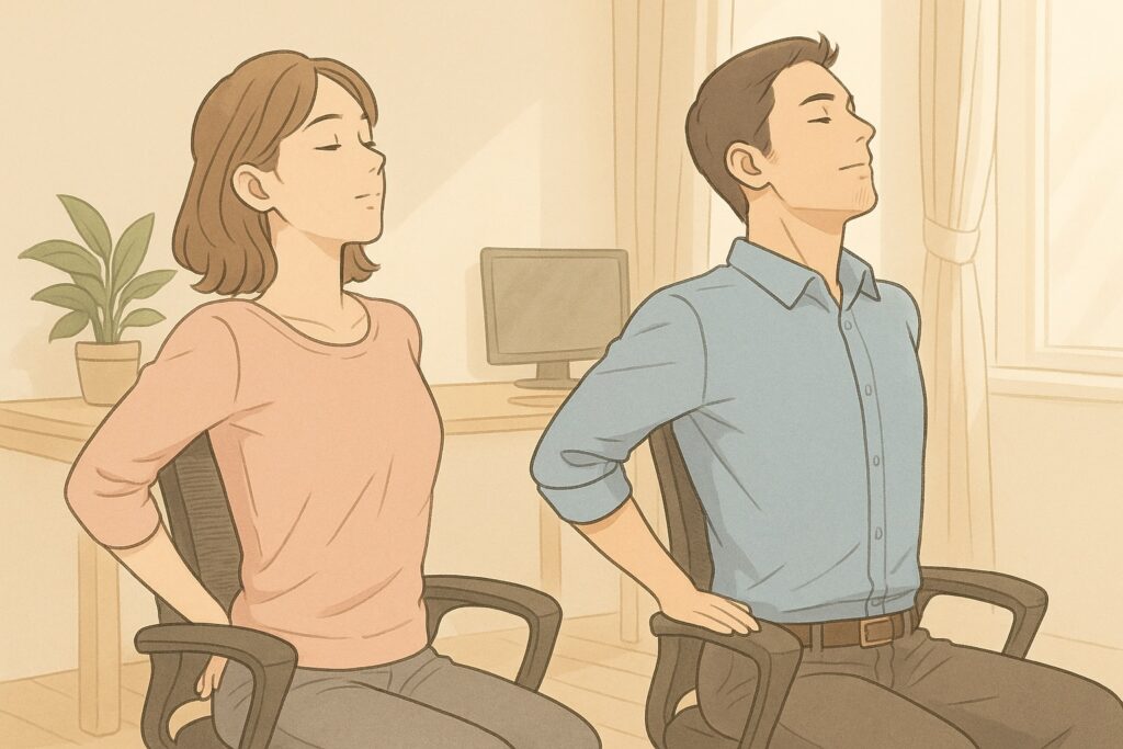 デスクワーク中でも取り入れやすいのが、座ったままのストレッチ。椅子に浅く腰かけ、背筋を伸ばした状態で上半身をゆっくり左右にひねります。目線を後ろに送るようにすると、背骨の動きがスムーズになります。