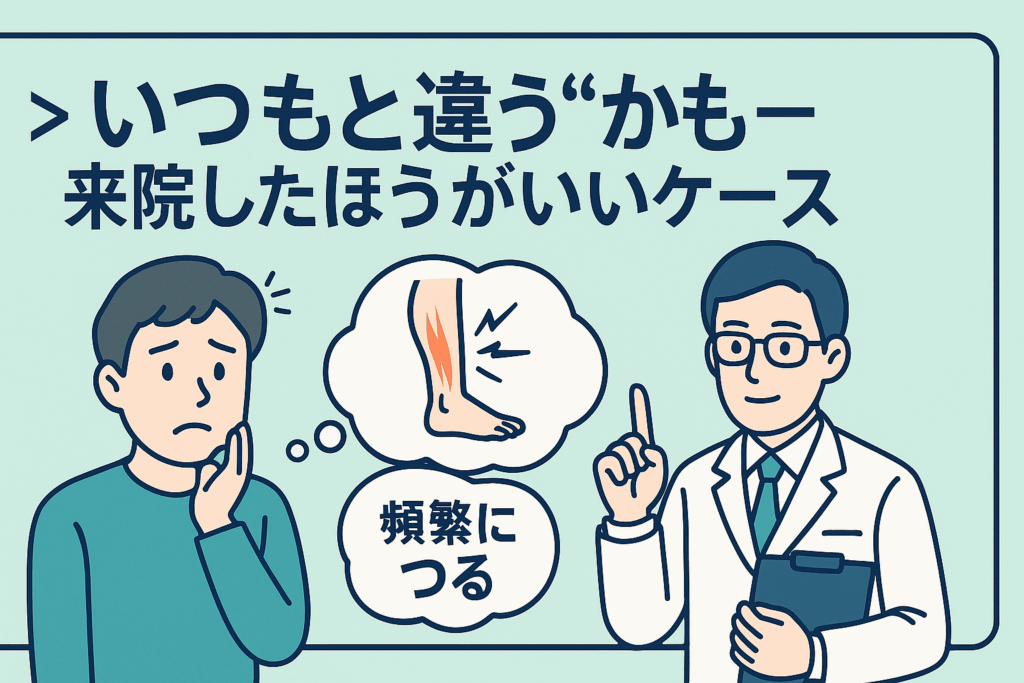 上記のような特徴がある場合、「つったからストレッチで終わり」ではなく、早めに“原因を明らかにする”ためにも来院を検討すると安心と言われています。