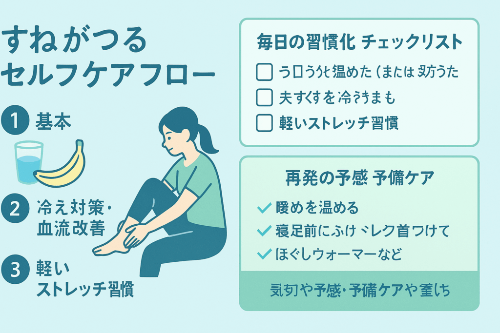 「すねがつる 伸ばし方」に関連したケアを一通り見てきましたが、ここで 再発を防ぐための/セルフケアフロー を整理しておきましょう。普段から「この順番でこれだけはやっておこう」という流れを持つことで、いざというときにも慌てず対応できるようになると言われています。
