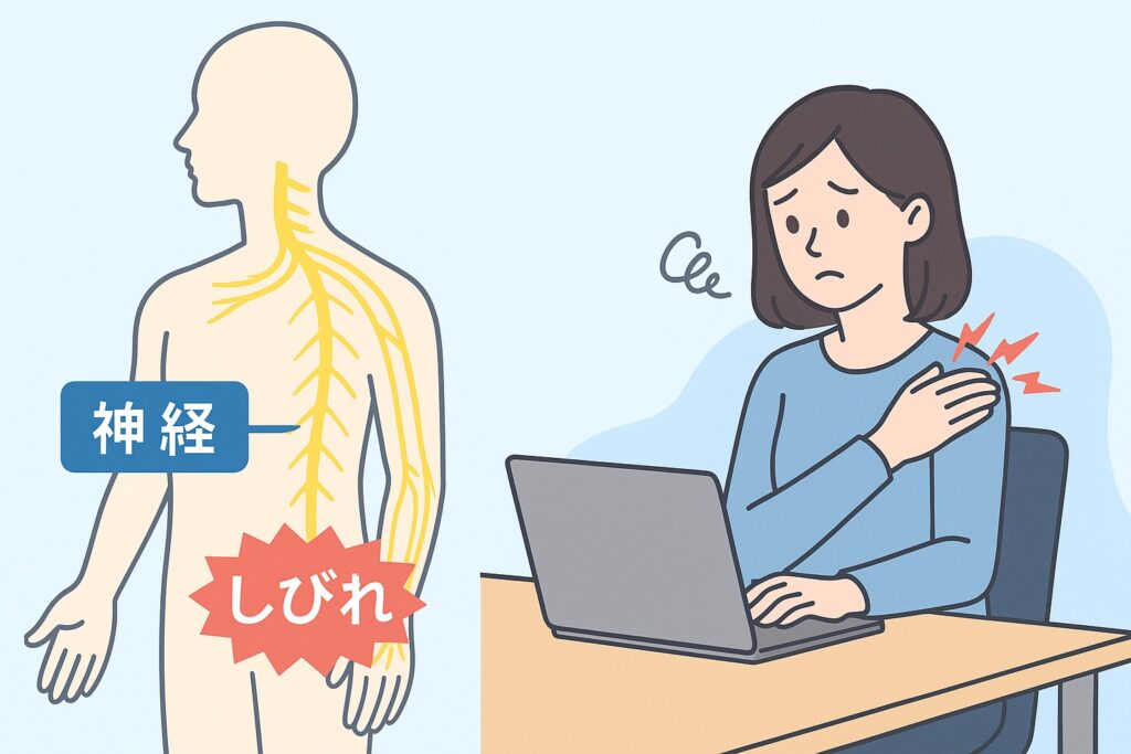 長時間のデスクワークやスマホ操作は、首や肩まわりの筋肉をこわばらせ、神経を圧迫しやすくすると言われています。
