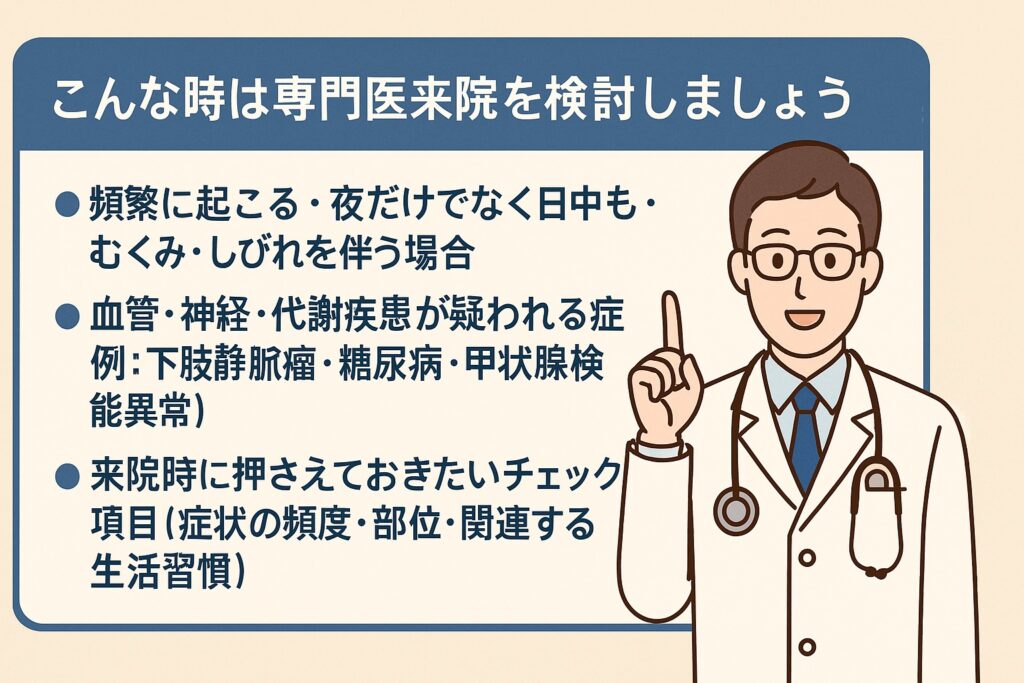 夜に足がつることはよくあると言われていますが、状況によっては専門医への来院を考えたほうがよいケースもあるとされています。「最近ちょっと気になるんだよね…」という段階で相談しておくと安心につながる場合もあります。ここでは、来院を検討するとよい場面を3つの視点で整理しました。