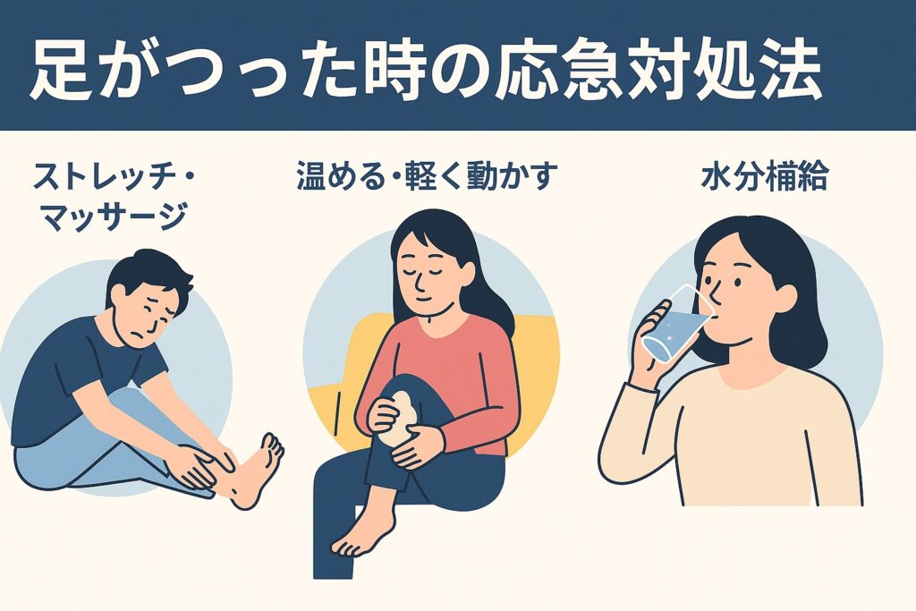 つりが落ち着いた後は、いきなり立ち上がらず、温める → 軽く動かす → 水分を補うという流れが安心だと言われています。