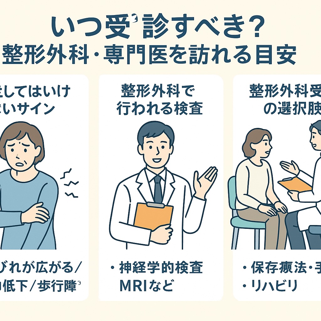 脊髄まで影響が及ぶと、手だけでなく足にも症状が広がる可能性があると紹介されています。「歩幅が狭くなる」「つまずきやすい」などの動作変化や、細かな作業がしづらくなるケースもあると言われています。さらに、ごくまれに排尿・排便の変化が起きる場合も説明されており、こうした変化が続く時は早めに専門機関へ相談することが推奨されています。