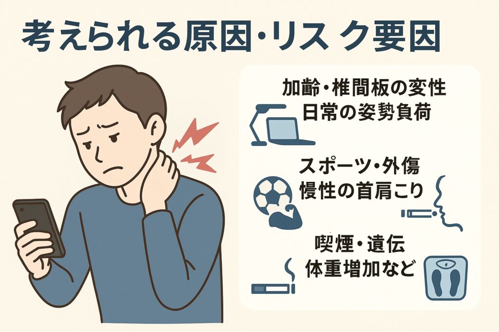 頚椎ヘルニアは「急に起こる大きなケガ」というより、日々の姿勢や加齢、生活習慣など複数の要因が積み重なることで起きやすくなると言われています。利用者の方からも「スマホの姿勢は関係あるの?」「スポーツ歴が影響している?」といった疑問をよく聞きます。ここでは一般的に紹介されているリスク要因を、できるだけ日常に結び付けて整理していきますね。