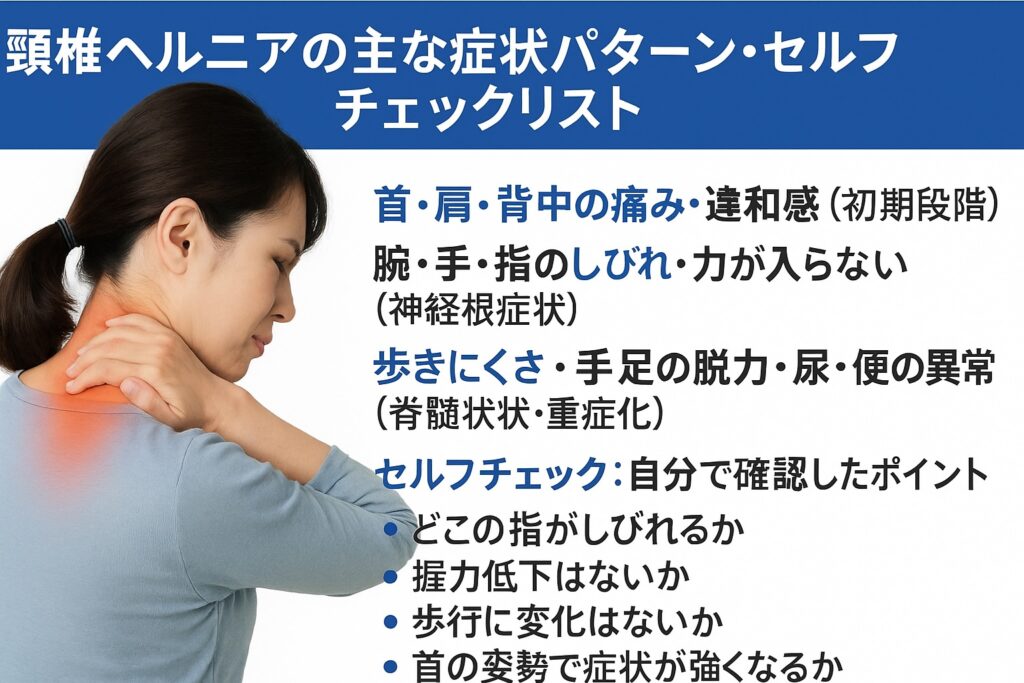 頚椎 ヘルニア 症状にお悩みの方へ。首・肩・腕・手足に広がる痛みやしびれの原因と段階別の特徴、自分でできるセルフチェックや整形外科受診のタイミングをわかりやすく解説します。