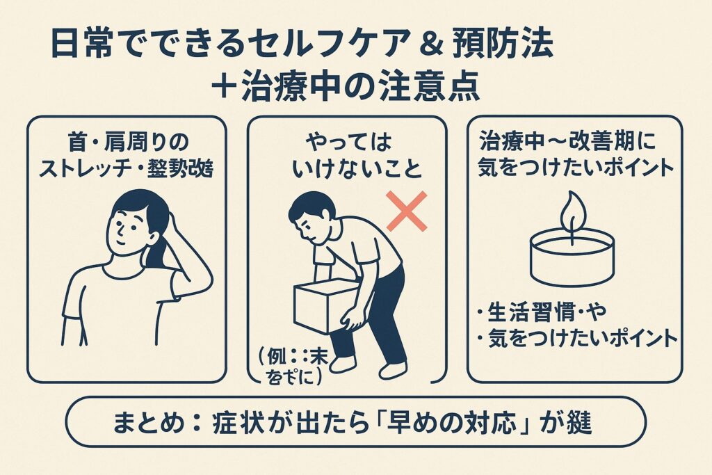 改善期に入っても油断は禁物で、重い物の持ち上げ方や姿勢のクセが戻ると再発しやすいと説明されています。「腕ではなく脚で持ち上げる」「急な首の動きを避ける」など、日常の小さな意識が大切だと言われています。