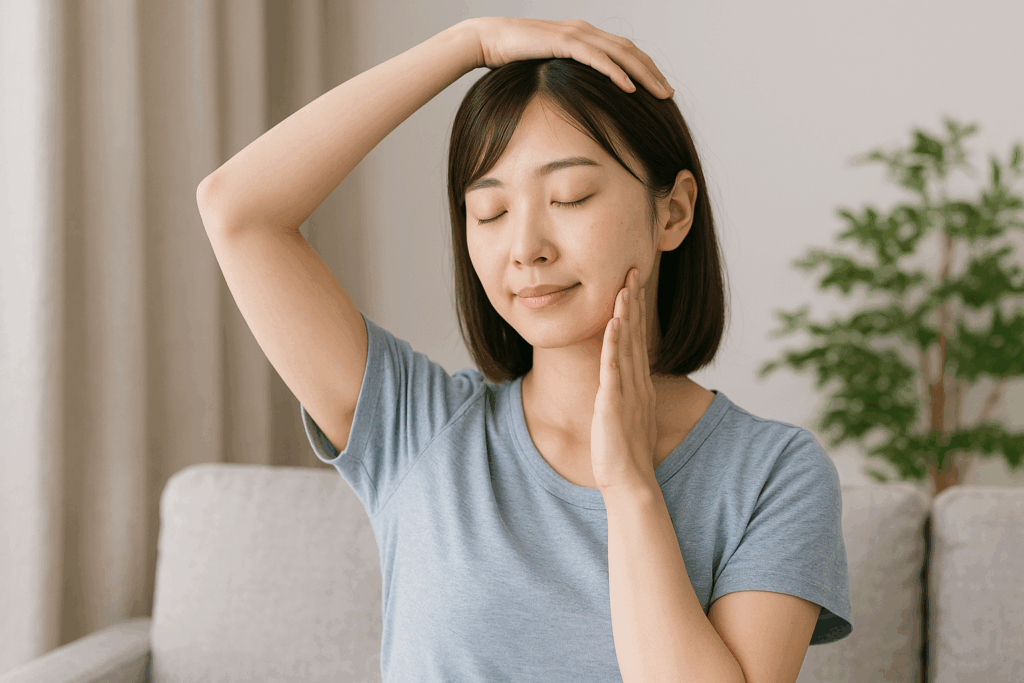 顎だけでなく、首まわりのストレッチを組み合わせると負担が軽くなりやすいと説明されることがあります。胸鎖乳突筋(きょうさにゅうとつきん)や肩の緊張が強いと、顎の動きにも関わると言われています。ゆっくり首を倒したり、肩を大きく回したりするだけでも、全体のつながりを感じやすいという話もあります。