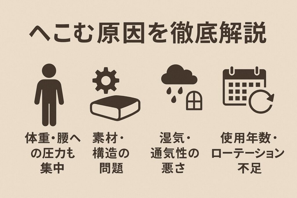 こうした要因が重なると、マットレスの中央だけが“くぼみ”として見た目や感触に現れ、寝心地に変化が出てくる流れです。