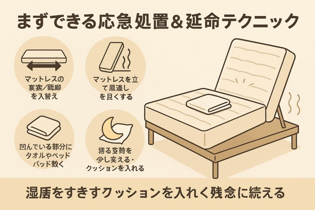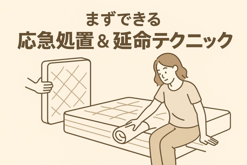 マットレスの劣化には湿気も影響すると言われています。エマ・スリープでも「内部に湿気がこもると柔らかくなりやすい」と説明されており(引用元:https://www.emma-sleep-japan.com/blogs/mattress/sagging)、**立て掛けて風を通す**ことはかなり現実的な延命策とされています。