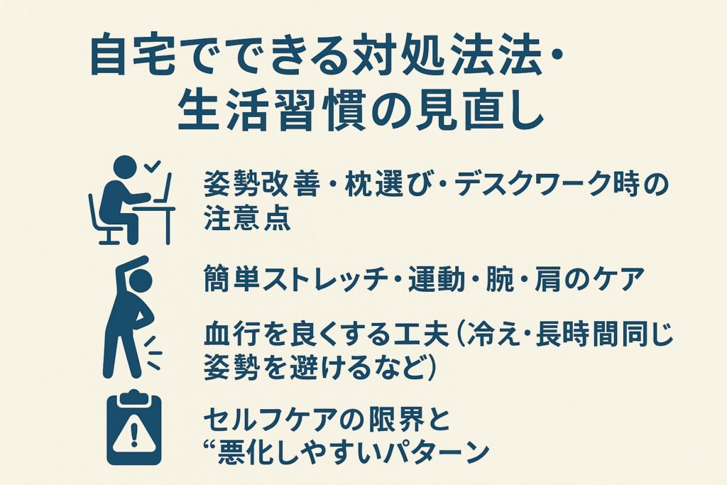 左腕の痺れが続くと、「家でできることってあるの?」と気になりますよね。実際、整形外科や専門サイトでも“生活習慣の見直し”が大切だと言われています(引用元: