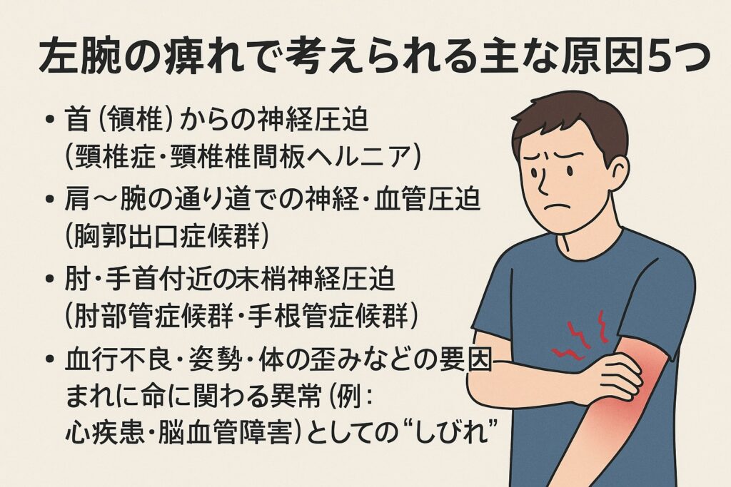 左腕 痺れでお悩みの方へ。なぜ左腕だけがしびれるのか、考えられる代表的な原因をわかりやすく解説し、すぐ始められるセルフチェックと対処法もご紹介します。