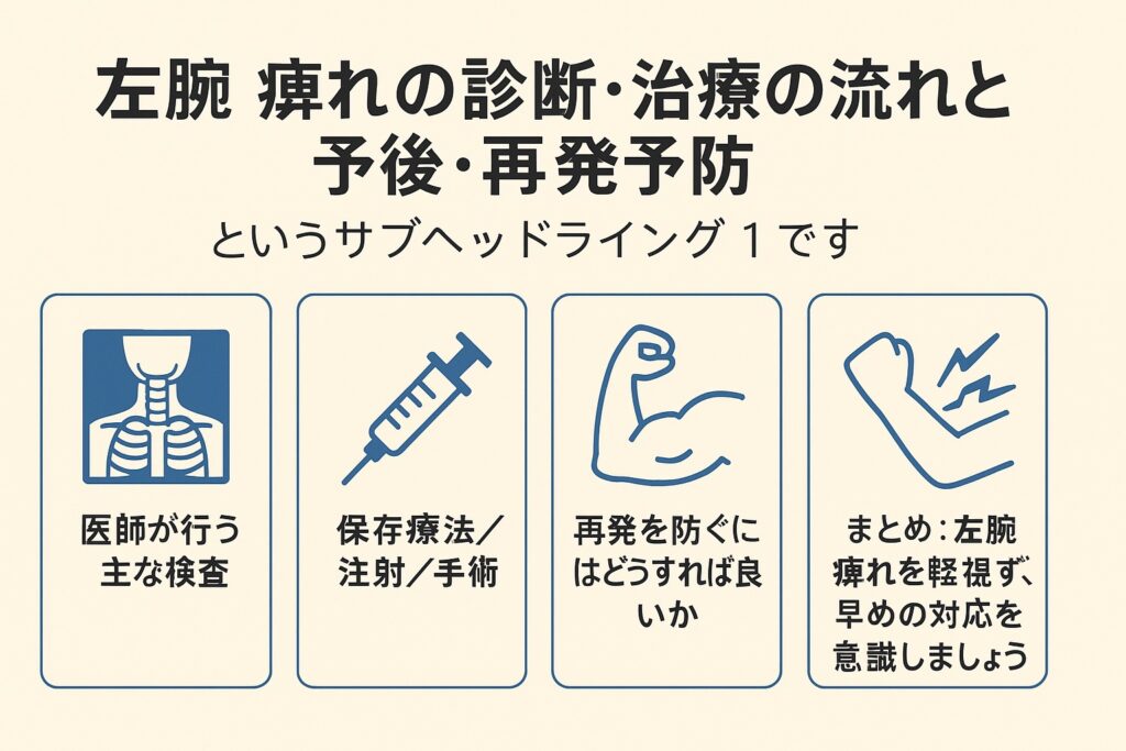 左腕の痺れが続くと「これって病院では何をするの?」と気になる方が多いですよね。実際、専門機関では“原因を見極めるための検査”と“状態に合わせた施術・保存的な対応”が中心になると言われています(引用元: