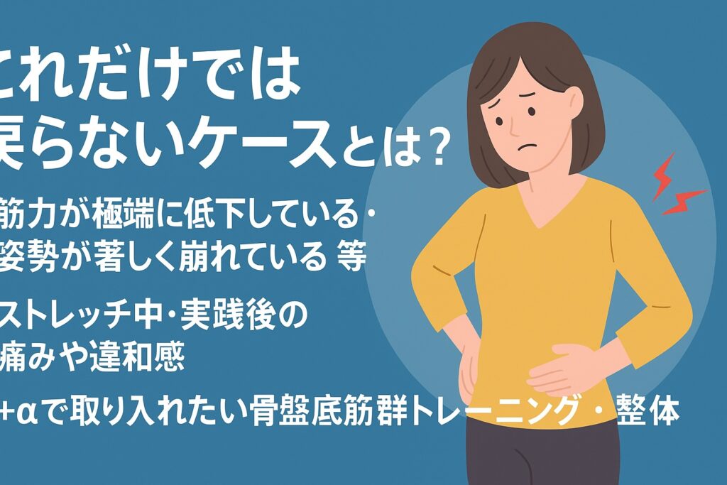 腸の位置を戻すストレッチは、多くの人にとって取り入れやすい方法と言われていますが、なかには「これだけでは戻りにくいケース」もあるようです。例えば、長期間の運動不足で筋力が極端に低下している場合や、姿勢が大きく崩れている状態だと、腸を支える腹横筋や骨盤底筋がうまく働きづらいと説明されています。特に骨盤の傾きが強い方は、ストレッチより先に“土台づくり”が必要になるケースもあると紹介されていました。
