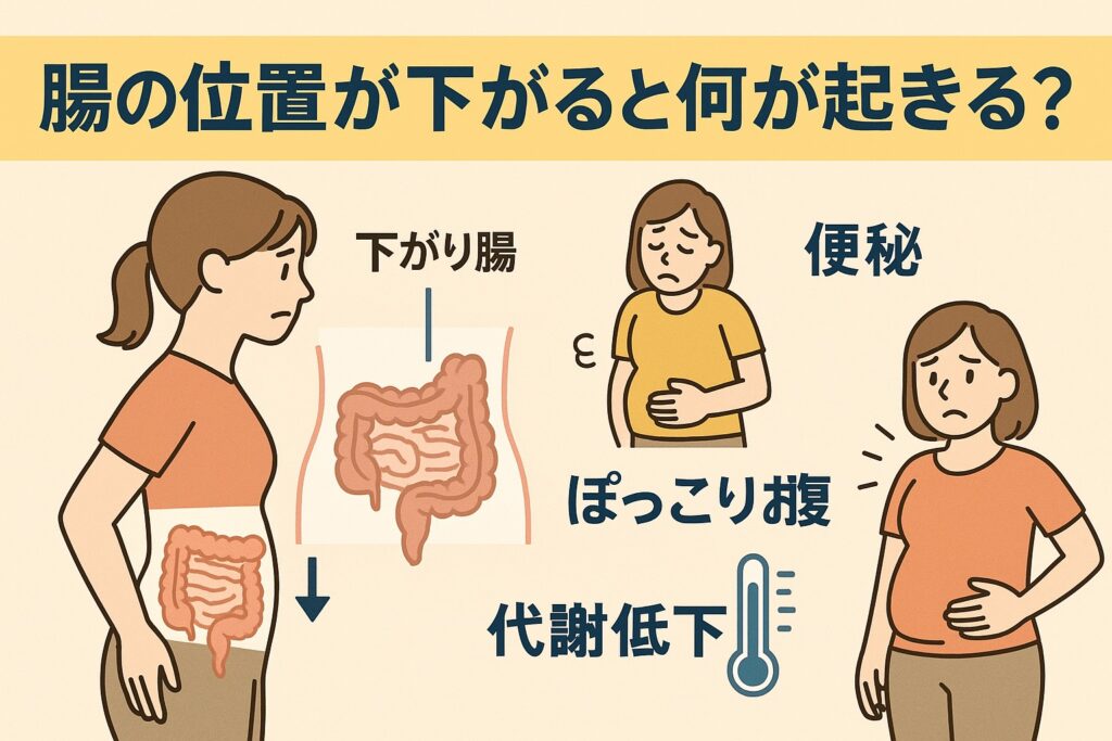 また、腸の動きが鈍くなると食べ物の移動速度が低下しやすく、代謝面にも影響が出るという話もあります。参考ページでも“腸が下がるとお腹まわりの巡りが落ちやすくなる”という説明が見られます。