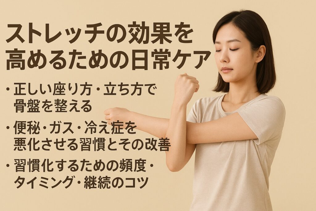 さらに、日常ケアとストレッチを組み合わせることで、腸が本来の位置に戻りやすい状態を維持できると言われています。姿勢の癖を意識しつつ、温活や軽い運動を取り入れることで、お腹まわりの巡りが整いやすいと説明されています。