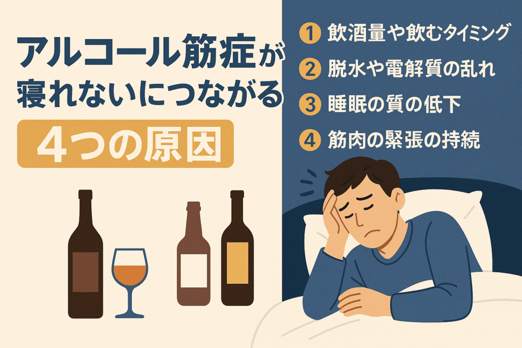 特に、ふくらはぎや太ももなど大きな筋肉が張っていると、その不快感が強く「横になるほど眠りにくい」という声も少なくありません。こうした背景から、アルコール筋症が「寝れない」感覚につながると考えられています。