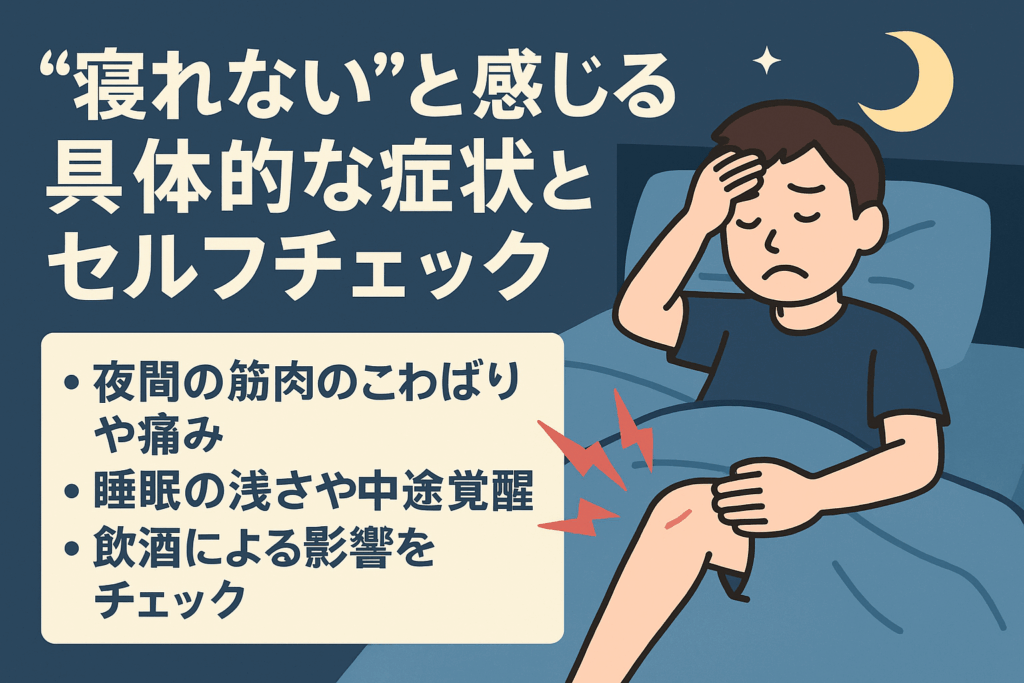 特に、大きい筋群(太もも・お尻・ふくらはぎ)の張りが強い場合、寝姿勢によって筋肉が刺激されやすく、「寝れない夜が続く」感覚につながることがあると説明されています。