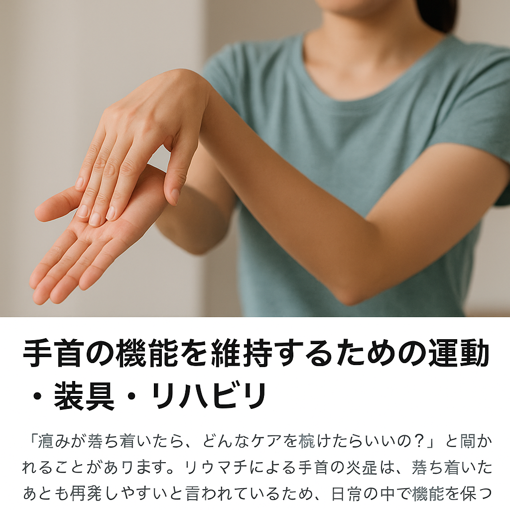 「痛みが落ち着いたら、どんなケアを続けたらいいの?」と聞かれることがあります。リウマチによる手首の炎症は、落ち着いたあとも再発しやすいと言われているため、日常の中で機能を保つ工夫が紹介されています。ここでは、専門家が取り上げる“運動・装具・リハビリ”の考え方を、分かりやすくまとめています。