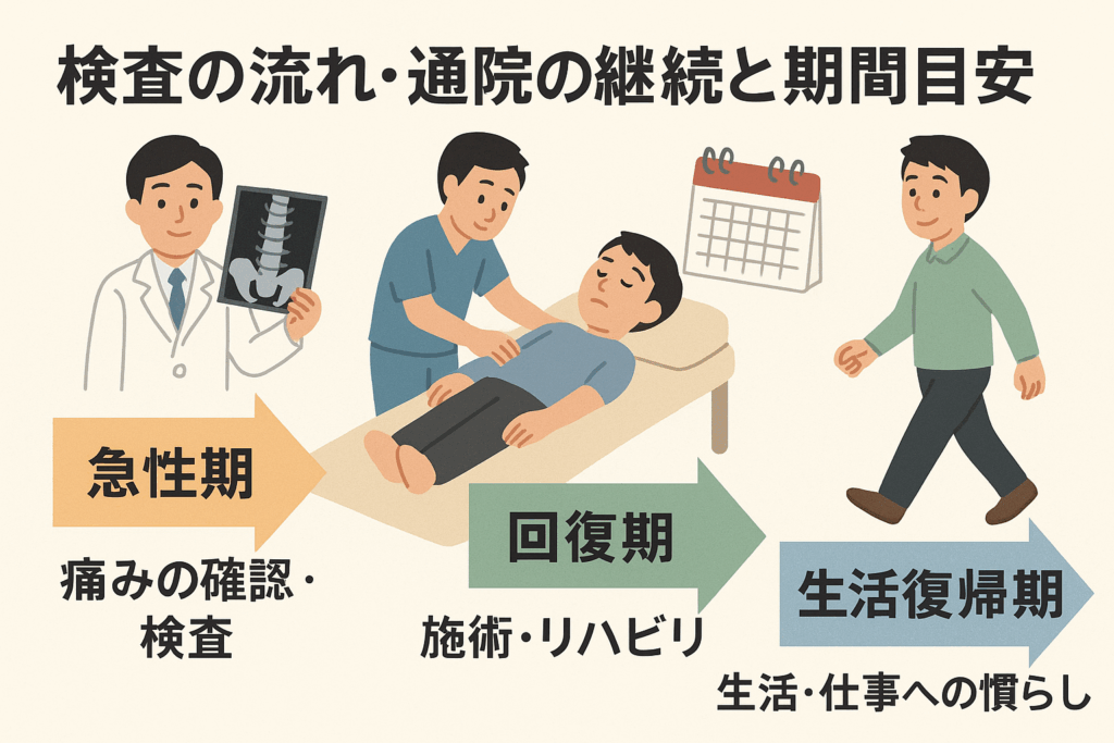 事故後の検査は「急性期 → 回復期 → 生活復帰期」の3段階で進むと言われています
