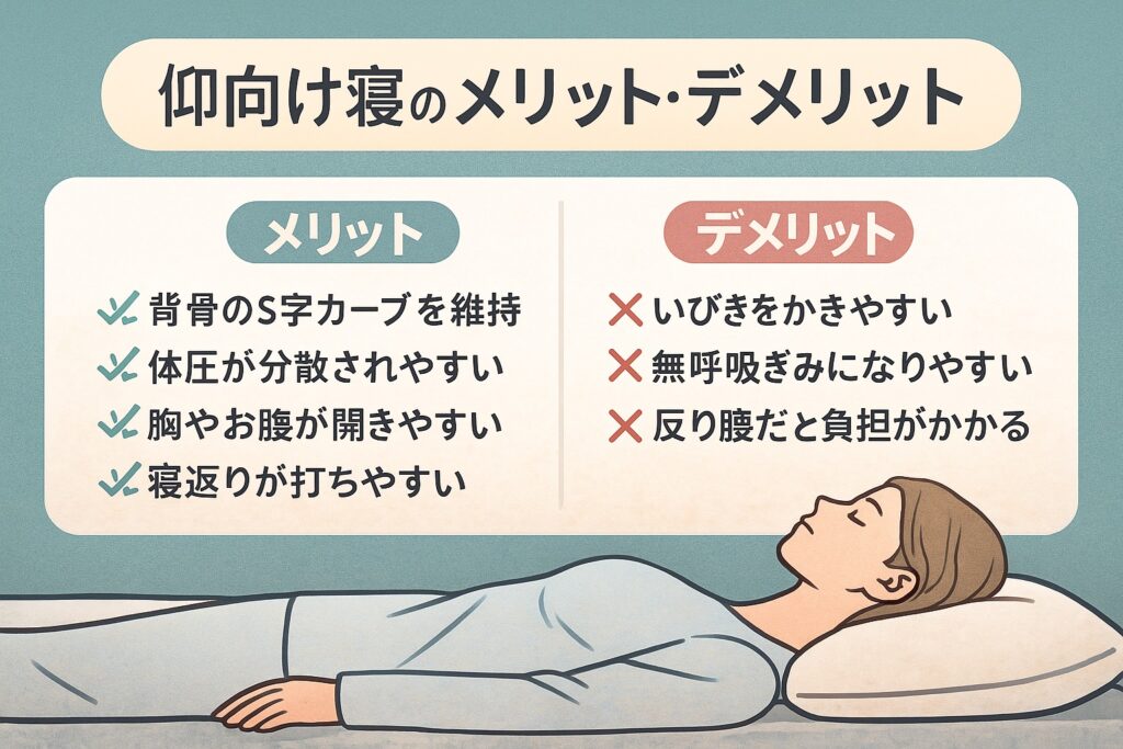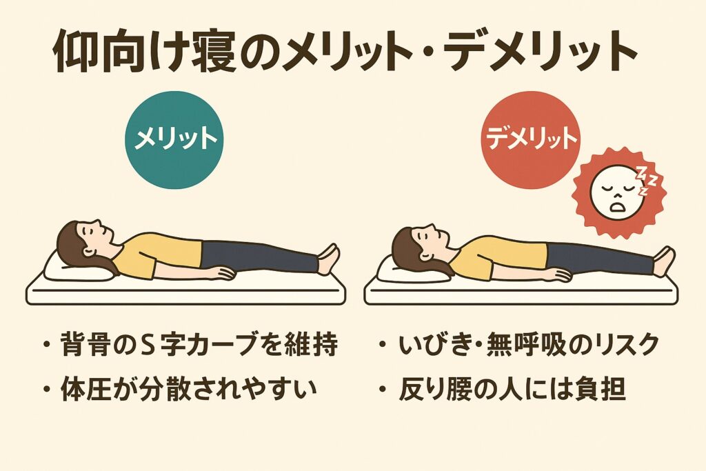 「仰向け=リラックスしやすい姿勢」と紹介されることもあり、背骨の自然なカーブを保ちやすいとも言われています。ただし、反り腰の人は腰に張り感が出やすいケースもあり、必ずしも全員に合うとは限らないとされています。