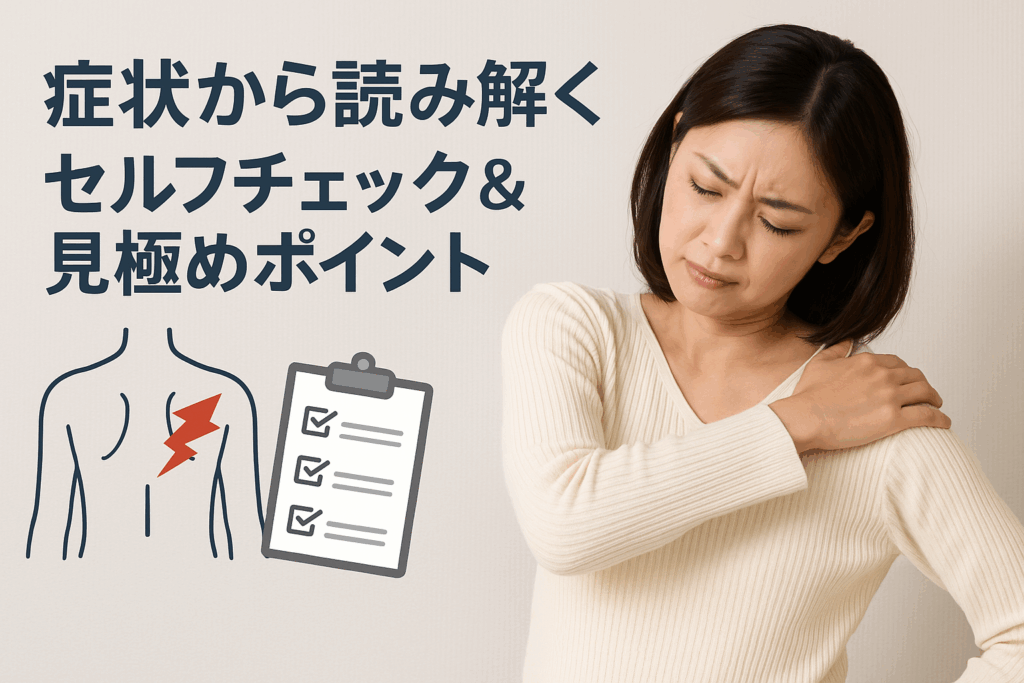 また、肩の動きが極端に制限される・しびれが同時に出る・数日経っても変化が乏しい、といった症状も、首まわりの神経や関節の可能性が示されることがあるようです。