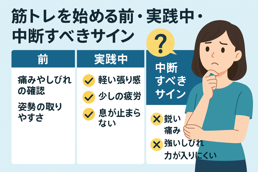また、「痛みが増える」「足にしびれが広がる」などの変化がある場合は、自己判断せず専門家に来院して触診・検査を受けると安心です。筋トレは万能ではないため、体の状態と相談しながら行うことが大切だと言われています。