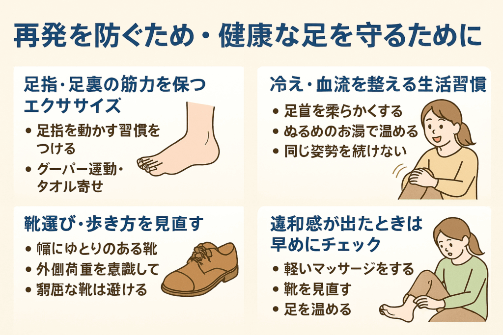 足の小指の「感覚がない」という状態が落ち着いたあと、「また同じことが起きたらどうしよう…」と心配になる方も多いようです。僕も相談をいただくことがありますが、生活の中で少し意識するだけで再発のリスクを減らせると言われています。ここでは、専門家の情報を参考にしながら、日常で無理なく続けられる予防のヒントをまとめました。どれも“今日から取り入れやすい”内容なので、自分のペースで試してみるのがおすすめです。