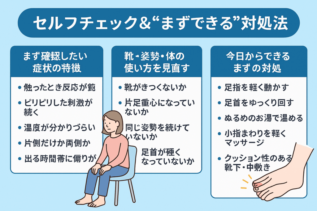 足の小指の感覚がないとき、「このまま様子を見ていいのかな?」と不安になる瞬間がありますよね。僕も相談を受けることが多いのですが、まずは落ち着いて“セルフチェック”をしてみることがすすめられています。急を要するケースもありますが、多くの場合は生活のクセや環境が関係していると言われています。ここでは、すぐに確認できるポイントと、自宅でできる簡単な対処のヒントをまとめてみました。
