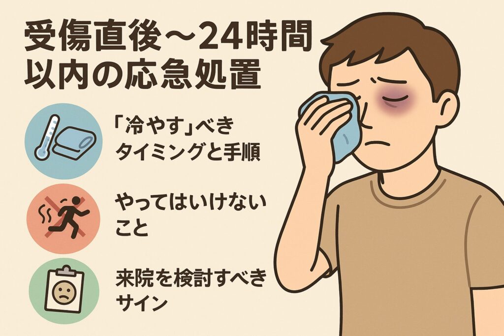 顔をぶつけてあざが出てきたとき、多くの人が「まず何をしたらいいの?」と戸惑うと言われています。冷やすべきなのか、触らないほうがいいのか、判断しづらいですよね。ここでは、受傷直後の24時間で意識したいポイントを、日常の会話に近い形でまとめています。参考記事でも“初期対応がその後の経過に影響しやすい”と言われているため(引用元:https://rehasaku.net/magazine/body/internalbleeding-healquickly/)、落ち着いて確認してみてください。