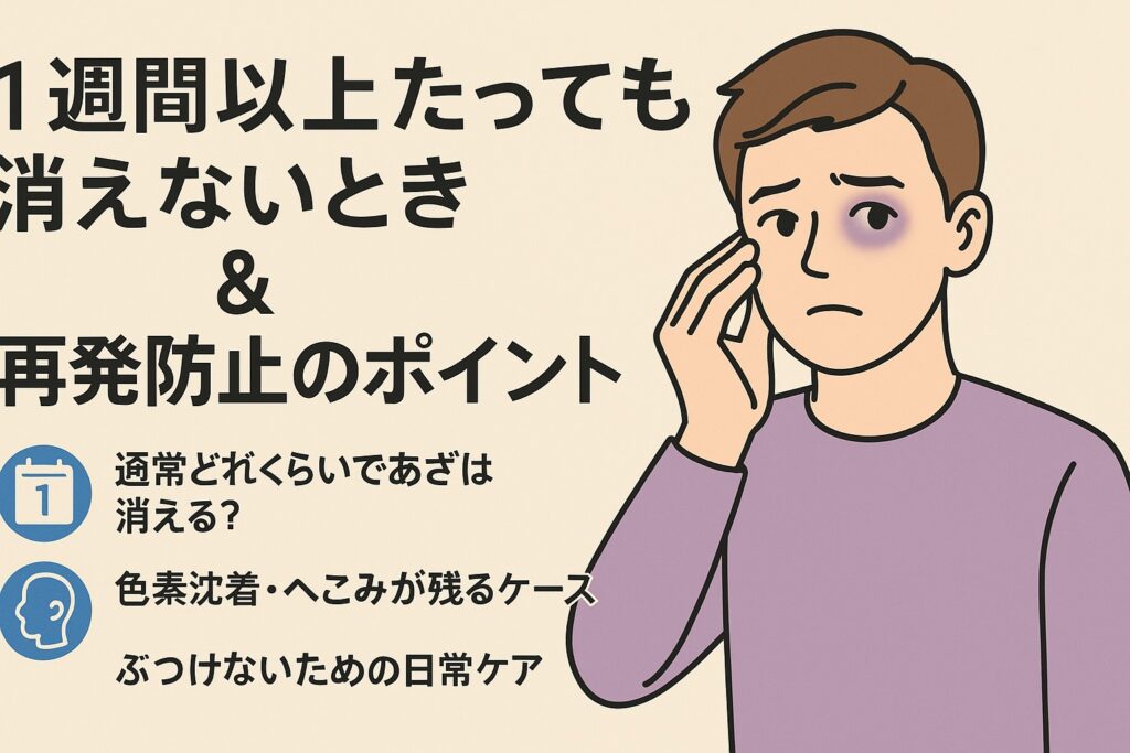 「そろそろ良くなると思っていたのに、まだあざが残っている…」という相談は意外と多いと言われています。通常の経過であざは少しずつ薄くなると紹介されていますが、1週間を超えても変化が乏しいと心配になりますよね。ここでは、一般的な消えるまでの期間や、色が残りやすいケース、再発を防ぐための日常ケアを会話するようなイメージでまとめています。