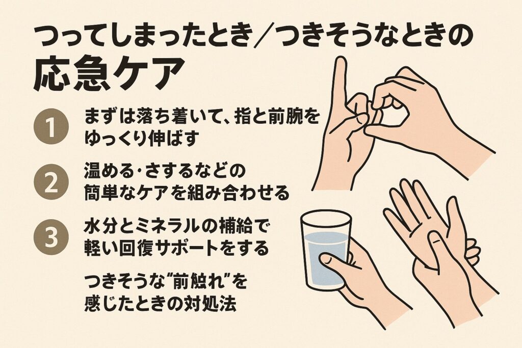 #指がつった時の対処#応急ケア#水分ミネラル補給#前触れ対策#指のつりと生活習慣