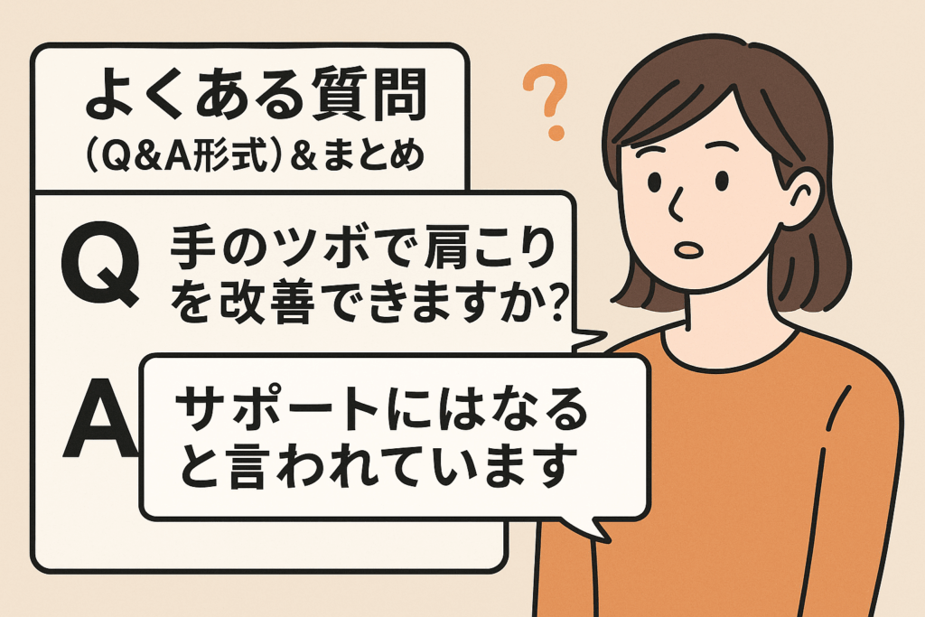 A:参考記事でも“手のツボは肩こりのサポートとして使われることが多い”と紹介されていて、単独で完全に楽になるというより“肩まわりの緊張がゆるみやすくなる場合がある”と言われています。特に合谷や後渓など、肩や首につながる経絡上のツボは刺激に反応しやすいようですが、慢性的な肩こりの場合はストレッチや姿勢の見直しなども合わせるほうが、負担を軽く感じやすいと説明されています。