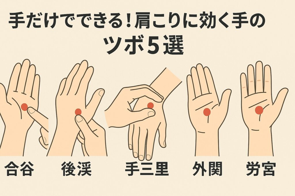 肩こり ツボ 手だけでラクになる?手の甲・掌・手首にある肩こりに効くツボを分かりやすく図解+押し方・頻度・注意点まで丁寧に解説します。デスクワーク・スマホ疲れのあなたにもおすすめのセルフケア。