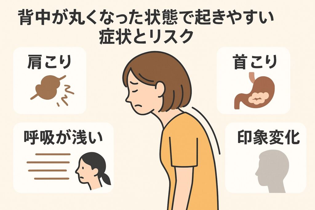 背中の丸まりをそのままにしておくと、肩こりや首の疲れ、呼吸の浅さにつながると言われています。姿勢が崩れることで、筋肉に負担が偏りやすくなるからだと説明されることが多いです。