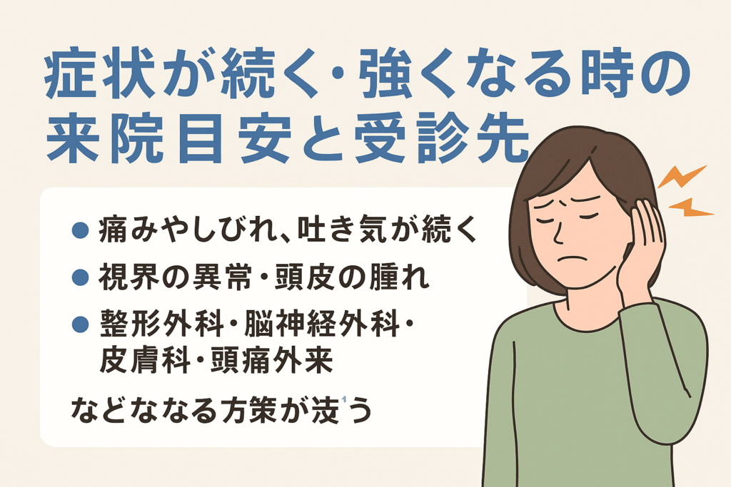 特に、後頭部〜首の痛みが強まり、しびれや吐き気がつながる場合は、神経が刺激されている可能性もあると説明されています。急に痛みが鋭くなる、視界がぼやける、頭皮が強く腫れているといったサインがある時も注意が必要とされています。