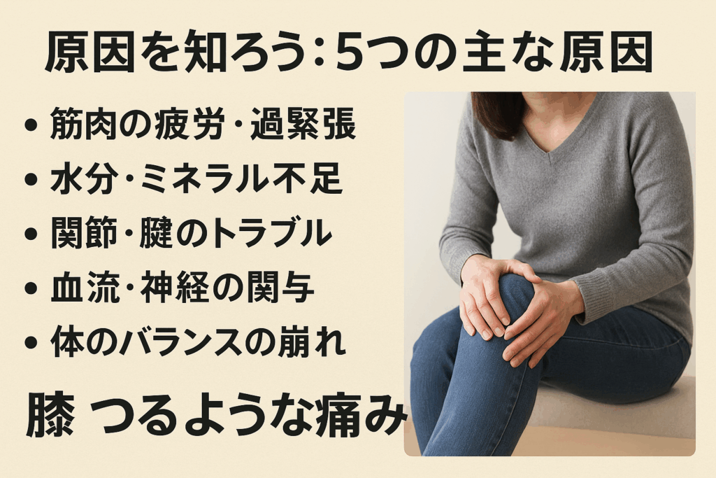 「膝 つるような痛み」に悩んでいませんか?筋肉の疲労・水分/ミネラル不足・関節トラブルなど、原因別にわかりやすく解説。セルフチェック・応急ケア・受診の目安も紹介します。