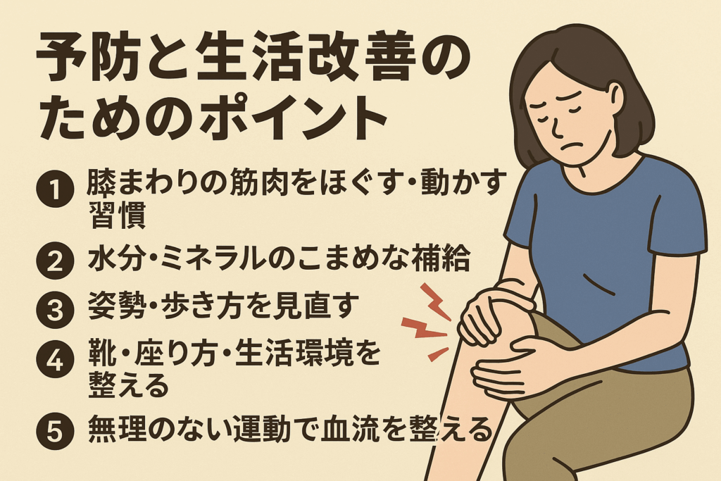 つるような痛みの予防は、“頑張りすぎない習慣づくり”がポイントです。日常のちょっとしたクセや環境を整えることで、膝の反応が変わってくると言われています。できるところから少しずつ試してみてください。