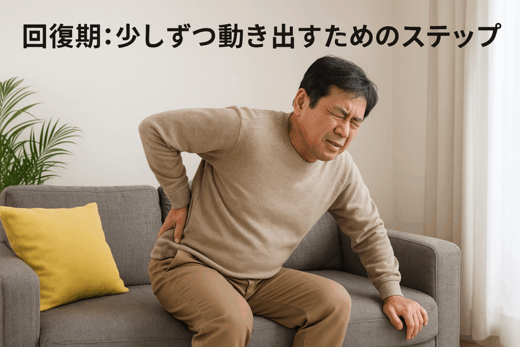 回復期は、痛みが和らぎ始める一方で、腰をかばう癖が残りやすい時期でもあるとされています。たとえば、
