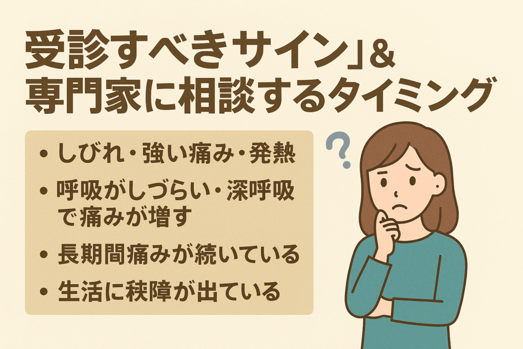 もちろん「すぐ重大な問題がある」という話ではありませんが、「単なる筋肉痛ではなさそう」というサインが出たときは、専門家に相談する流れも選択肢として考えておくと安心です。