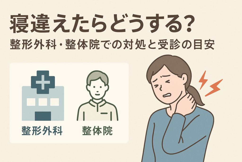 「寝違えた 首痛い…自分でケアしても良くならない」「そもそもこれって寝違え?」と思ったとき、どう判断して、どこに相談すればよいか。ここでは、自宅ケアだけでは不十分かもしれない場合の“受診の目安”と、“整形外科・整体院での対処内容”を整理します。