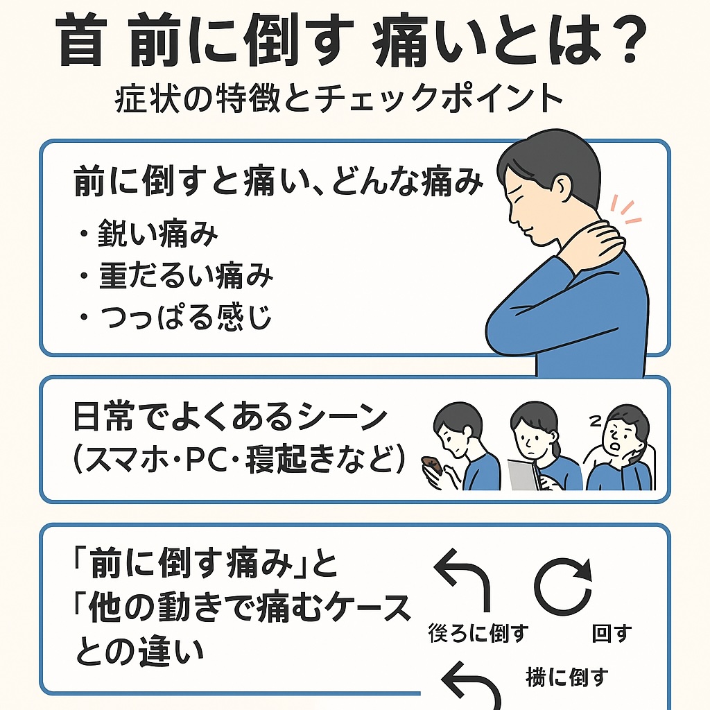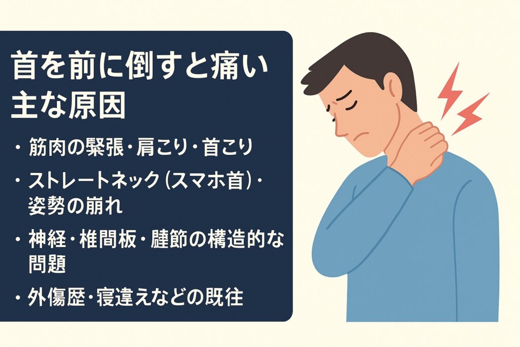 首 前に倒す 痛いと感じる原因を解説。筋肉・姿勢・神経圧迫まで考えられる要因をわかりやすく説明し、タイプ別の対処法・自宅でできるケア・受診すべきサインまで完全ガイドします。