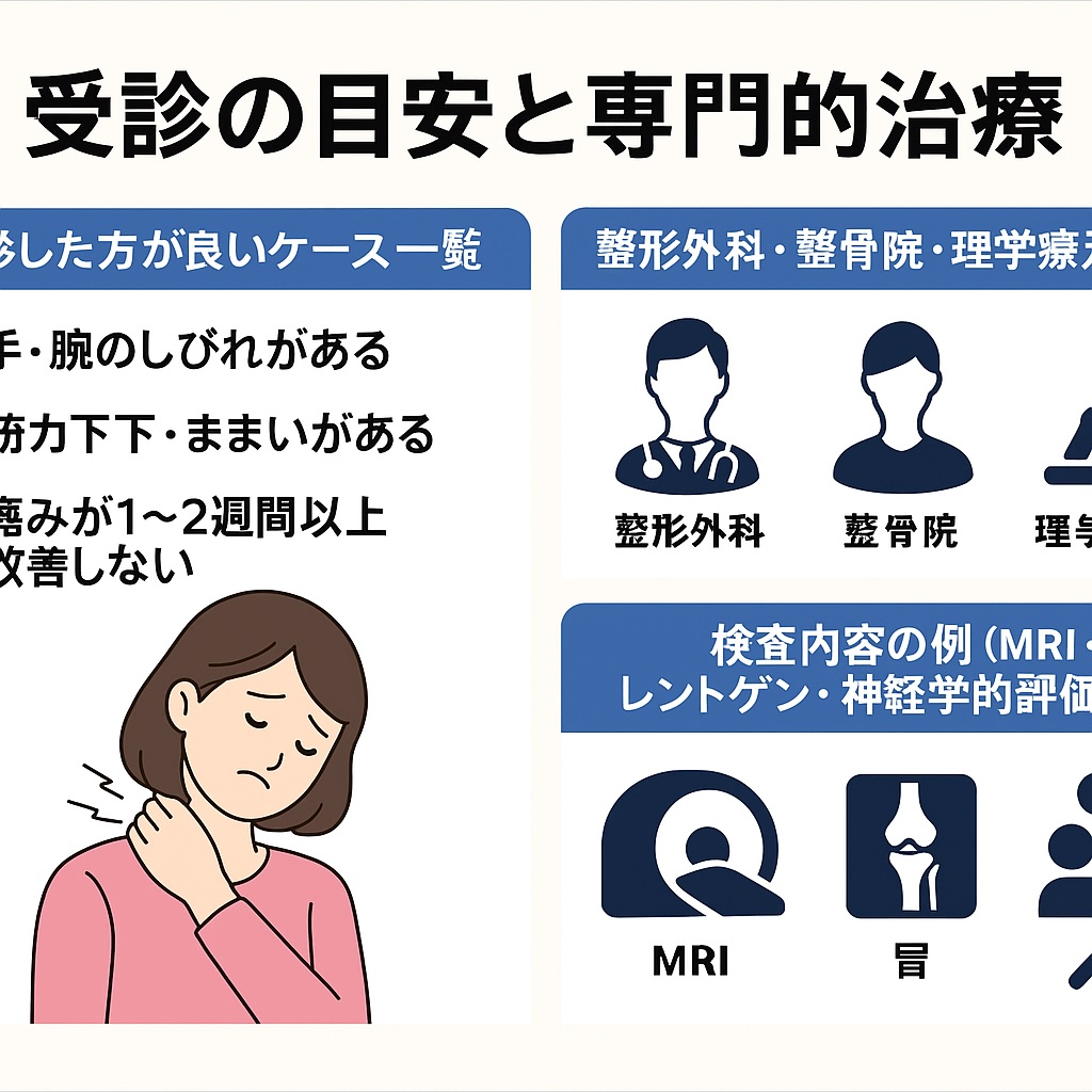 首 前に倒す 痛い症状に加えて、手や腕のしびれを感じる場合は注意が必要と言われています。また、「力が入りづらい」「物を落としやすくなった」といった筋力低下や、めまいを伴うケースも来院の目安になるようです。