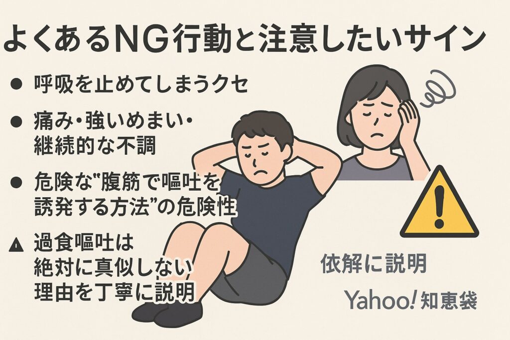 腹筋運動中の不快感について調べていると、「腹筋吐き コツ」といった言葉と一緒に、危険性の高い情報が検索結果に出てくることがあります。ここでは、やりがちなNG行動と、見逃さないほうがよい体のサイン、そして検索上に存在する注意すべき情報について、冷静に整理します。