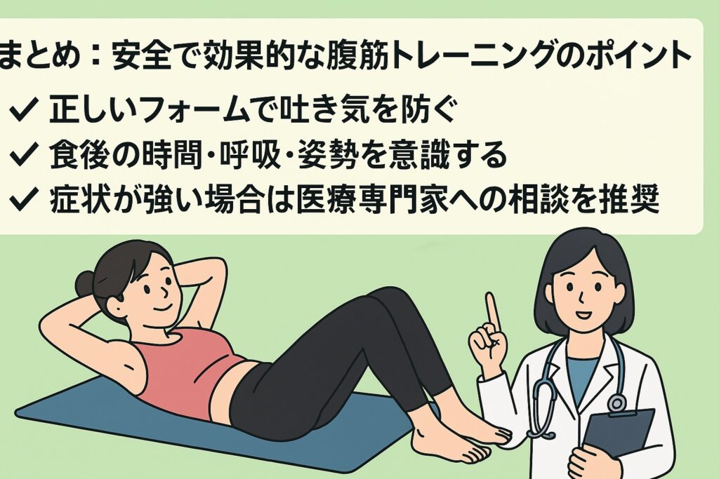 ここまで見てきたように、腹筋運動で「吐きそう」と感じるかどうかは、筋力だけの問題ではないと言われています。腹筋吐き コツとして大切なのは、フォーム・呼吸・タイミングをセットで考えること。最後に、安全性と効果の両立を意識したポイントを整理します。