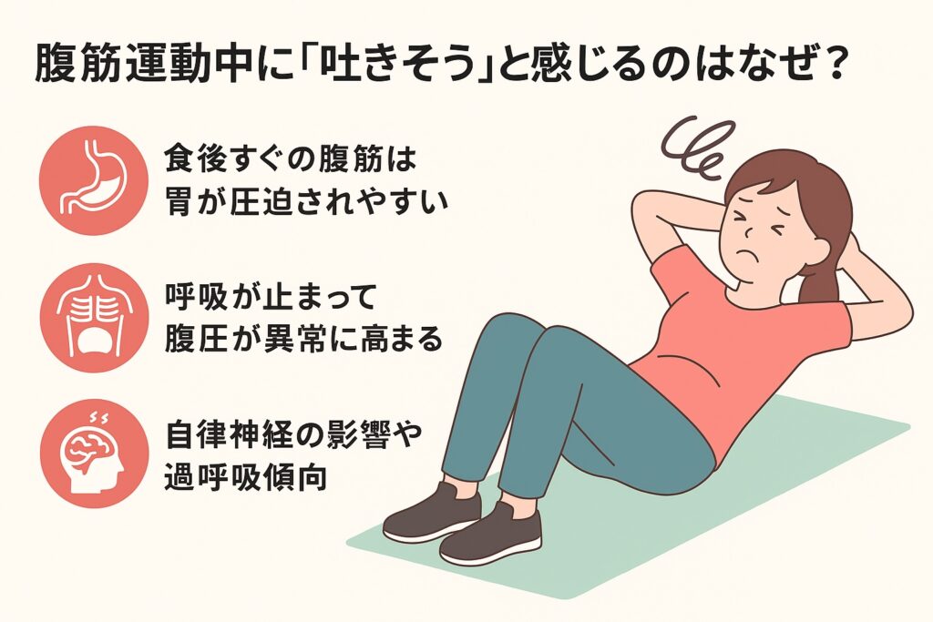 腹筋トレーニングをしていると、「途中で気持ち悪くなる」「吐きそうになる」と感じた経験がある方も少なくありません。実はこれ、珍しいことではなく、体の使い方やタイミングが影響していると言われています。ここでは、腹筋中に吐き気を感じやすくなる主な理由を、体の仕組みとあわせて整理していきます。食後すぐの腹筋で胃が圧迫されやすくなる理由「ご飯のあとに少し運動しよう」と腹筋を始めた途端、ムカムカしてしまった…そんな声もよく聞きます。食後は胃の中に食べ物が残っているため、腹筋を縮める動作によって胃が圧迫されやすくなります。その結果、胃の不快感や吐き気につながることがあると言われています。からだなびでも、食後すぐの運動は消化器への負担が大きくなりやすいと紹介されています。引用元:https://www.karadana-bi.com/呼吸が止まり腹圧が過剰に高まる影響腹筋に力を入れることばかり意識すると、無意識のうちに息を止めてしまう方も多いです。呼吸が止まると腹圧が一気に高まり、胃や横隔膜が強く押されます。その刺激が「気持ち悪さ」として表れ、吐きそうな感覚につながる場合があると考えられています。「ちゃんと息してた?」と自分に問いかけてみるのも大切ですね。自律神経の乱れや過呼吸傾向も関係することがある腹筋運動は想像以上に体への刺激が強く、慣れていない方ほど緊張しやすい傾向があります。その緊張が自律神経に影響し、動悸や吐き気を感じるケースもあると言われています。また、呼吸が浅く早くなる過呼吸気味の状態も、不快感を強める要因の一つとされています。
