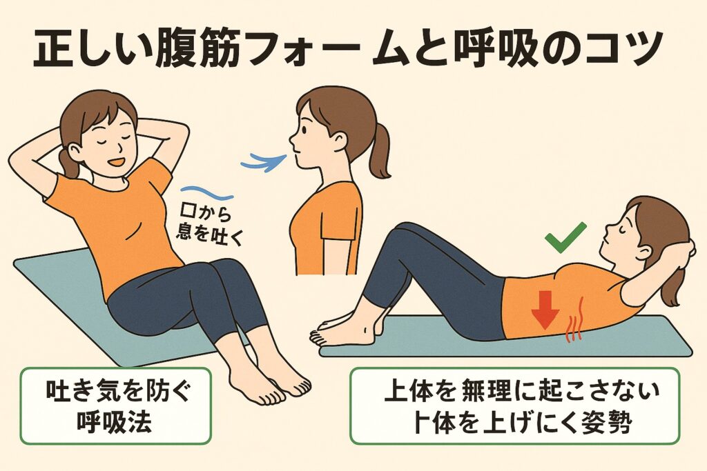 腹筋吐き コツ|腹筋運動中に「吐きそう…」と感じる原因と正しい呼吸・フォームを徹底解説。安全に腹筋効果を出すための対処法とNGポイント、注意すべき症状をわかりやすく紹介します。