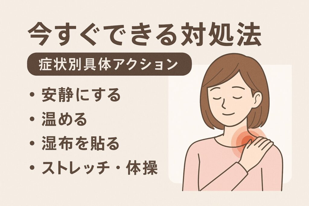 「右鎖骨の上が痛い」と感じたとき、まずは日常でできる対応から試してみる方も多いと思います。ここでは、無理のない範囲で取り入れやすい対処法を症状別に整理します。会話するように、一つずつ確認してみてください。