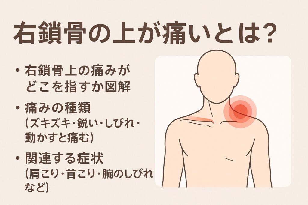 「右の鎖骨の上がなんとなく痛い」「押すとズーンとするけど、ここって何があるの?」そんなふうに感じて検索している方も多いかもしれません。右鎖骨の上の痛みは、筋肉・神経・関節など複数の要素が関係していると言われています。まずは、どのあたりが痛むのか、どんな症状が出やすいのかを整理してみましょう。右鎖骨上の痛みが出やすい場所とは右鎖骨の上とは、鎖骨のすぐ上にあるくぼみ周辺を指すことが多いです。この部分には、首から肩・腕へつながる筋肉や神経、血管が集まっています。「首と肩の境目あたりが痛い」「肩の少し内側が気になる」と感じるケースもあり、人によって表現が少し違うのが特徴です。なお、鎖骨周辺の違和感や痛みは、姿勢や日常動作の影響を受けやすい部位だと言われています。引用元:https://rehasaku.net/magazine/shoulder/pain-under-collarbone/痛みの種類|ズキズキ・鋭い・しびれ感など右鎖骨の上の痛みには、いくつかのパターンがあります。たとえば、「ズキズキと脈打つような痛み」「ピリッと鋭い痛み」「触るとしびれる感じ」などです。また、「腕を動かすと痛みが出る」「じっとしていても違和感がある」といった違いも見られます。こうした痛みの出方は、筋肉の緊張や神経への刺激と関係している場合があると言われています。引用元:https://rehasaku.net/magazine/shoulder/pain-under-collarbone/一緒に出やすい関連症状右鎖骨の上が痛いとき、肩こりや首こりを同時に感じることも少なくありません。「最近デスクワークが続いていて首が重い」「肩から腕にかけてだるい」といった声もよく聞かれます。場合によっては、腕のしびれや動かしづらさを感じる人もいるようです。これらの症状は単独ではなく、体の使い方や姿勢のクセとつながって出てくることがあると言われています。引用元:https://rehasaku.net/magazine/shoulder/pain-under-collarbone/