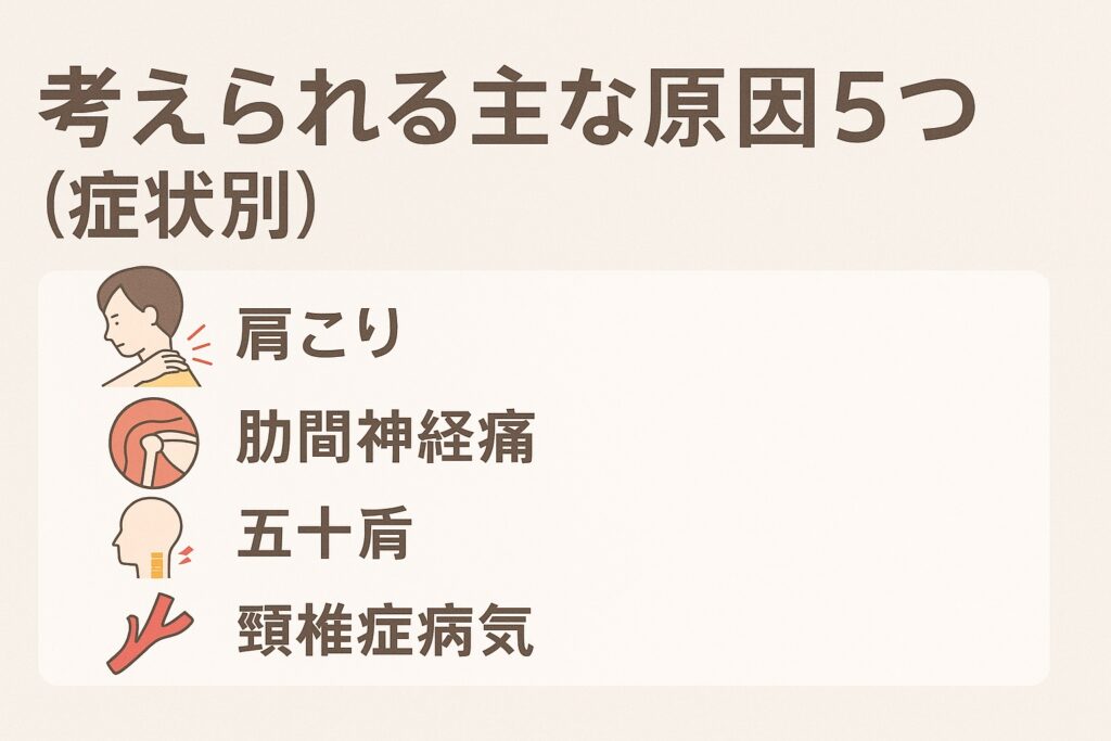 右鎖骨の上が痛いと感じる背景には、いくつかの代表的な原因があると言われています。「これって肩こり?それとも別の問題?」と迷う方も多いため、症状別に整理して見ていきましょう。会話するように、一つずつ確認してみてください。