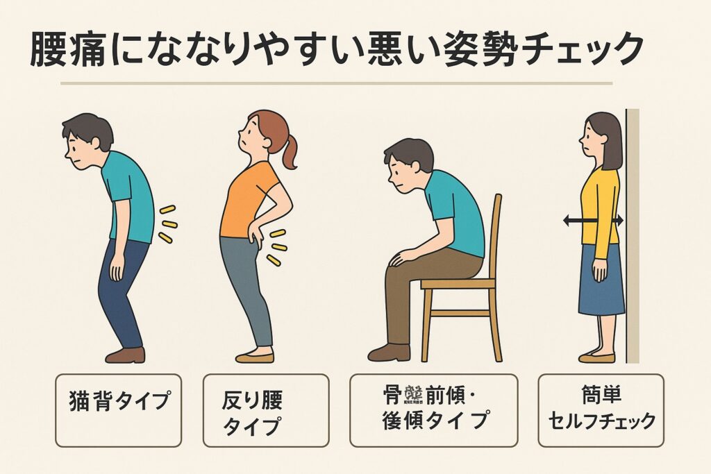 そんな声、実はとても多いです。ここでは腰痛につながりやすい姿勢をタイプ別に整理しつつ、自宅でできる簡単なチェック方法も紹介します。
